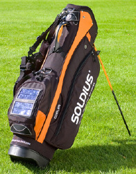 No persze ez nem ám egy akármilyen golftáska kell, hogy legyen, hanem egy spéci Soldius gyártmányú high-tech modell. Ennek a táskának az a legfőbb ismertetőjele, hogy oldalán egy méretes napelem teljesít szolgálatot. Az általa termelt áramot egy mini akkumulátor tárolja, amennyiben pedig valaki fel akarja tölteni lemerült mobiltelefon akkumulátorát, nem kell mást tennie, mint egy arra alkalmas vezetékkel csatlakoztatni a telephez a készüléket.