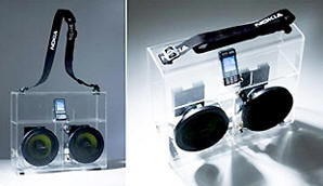 Történt ugyanis, hogy amikor a piacvezető finn gyártó a napokban megnyitotta legújabb gigant shopját Helsinkiben, a hivatalos megnyitón felbukkant egy igen csak érdekes, új mobiltelefonos kiegészítő termék. Ez az újdonság tulajdonképpen nem más, mint egy átlátszó műanyagból készült, pánttal ellátott kis hordtáska, melyben két nagyméretű hangszóró teljesít szolgálatot.