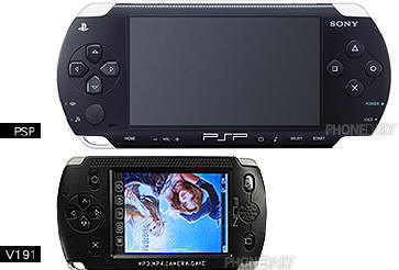 Így született meg az a V191 típusjelzésű masina, mely tulajdonképpen nem más, mint egy mosás közben némileg összement Sony PSP. A kínai másoló mesterek a PSP logót azért már nem merték rábiggyeszteni a készülékházra, így azt ez esetben a FUN szócska helyettesíti.