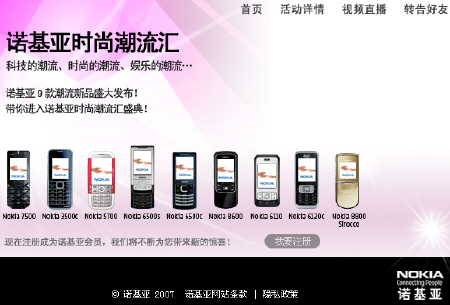 Az egyelőre még titkos Nokia 7500-át a gyártó kínai website-ján, annak is főoldalán fedezhetjük fel. Az alábbi hivatalos Nokia anyag baloldalán lévő telefon az 7500 típusjelzésű újdonság: