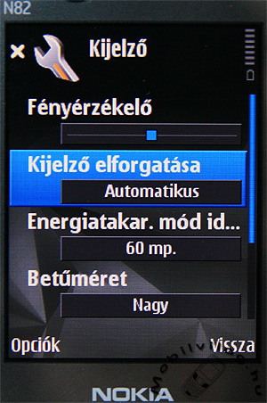 A 16 millió színárnyalatú és nem érintésérzékeny LCD fényerejét egy felette elhelyezett fényszenzor (öt fokozat) állítja a külső fényviszonyoknak megfelelően. A személyre szabhatóságról öt gyári N-series téma és könnyen átvariálható menürendszer gondoskodik. A korábban többek közt a Nokia 6290-esen is megismert V-, illetve köralakú menüről ezúttal le kell mondanunk, így marad a már jól ismert rácsos, illetve listás elrendezés. Egy apróság: megadhatjuk, hogy az ikonok egyállapotúak vagy animáltak legyenek. A Nokia N82 egyébként a Feature Pack 1-gyel megspékelt S60 3rd Edition (Symbian 9.2 operációs rendszer) platformra épül, az FP2-re tehát még mindig várnunk kell.
