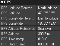 A fényképek GPS adatai, illetve a készítés helye egy arra alkalmas szoftverben (akár térképen) természetesen a számítógépünkön is megjeleníthetők. Az alábbi screenshot például azt mutatja, hogy az ACDSee Pro 2 milyen GPS bejegyzéseket talált egy fotó EXIF adatai között.