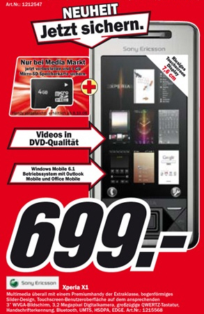 Utánanéztünk, hogy Németországban elsők közt a Media Markt elektronikai nagyáruházakban debütál a Sony Ericsson Xperia X1, melynek kártyafüggetlen ára 699 euró. Ez az átszámítva mintegy 170 ezer forintos összeg még akkor is túlzottnak mondható, ha tudjuk, hogy a Media Marktban most egy 4 GB kapacitású microSD memóriakártya is jár a telefon mellé. Megjegyzendő, hogy a cég nem mától, hanem csak jövő hét szerdától (október 8.) forgalmazza a smartphone-t.