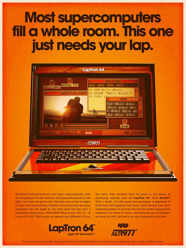 Hasonló hangulat keríthette hatalmába Alex Varanese-t is, aki nemrég érdekes kollekcióval rukkolt elő. A grafikus művész olyan nyomtatott reklámanyagokkal hívta fel magára a figyelmet, melyek a ma embere által kedvelt, gyakran használt négy elektronikus eszközt helyezi vissza a 33 évvel ezelőtti korba. Varanese ALT/1977 nevű sorozata hordozható zenelejátszót (Pocket Hi-Fi), laptopot (Laptron 64), mobiltelefont (MobileVoxx) és kézi konzoljátékot (Microcade 3000) hirdet – a művész szerint nagyjából így néztek volna ki ezek az eszközök, ha a bő három évtizeddel ezelőtti technológia lehetővé tette volna előállításukat.