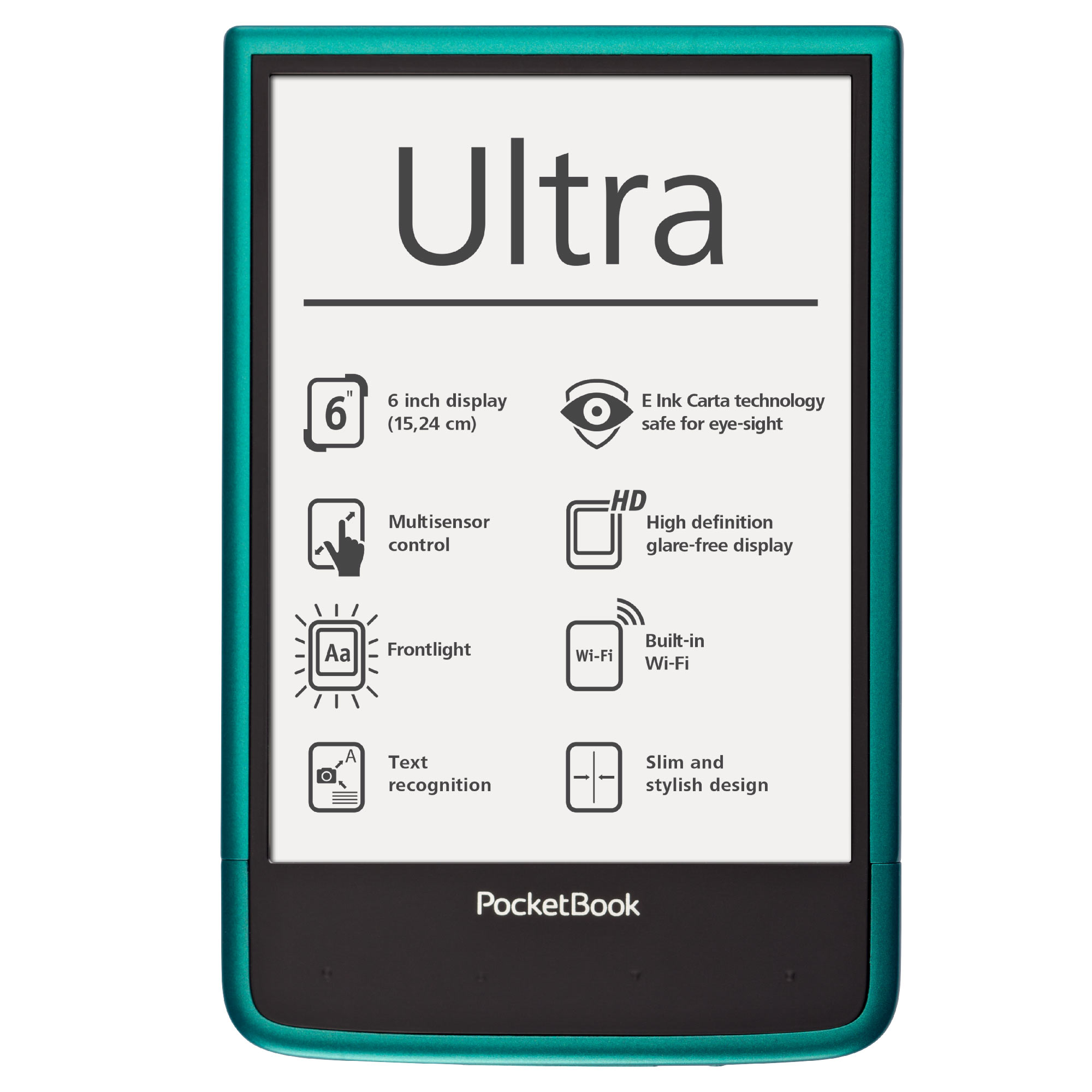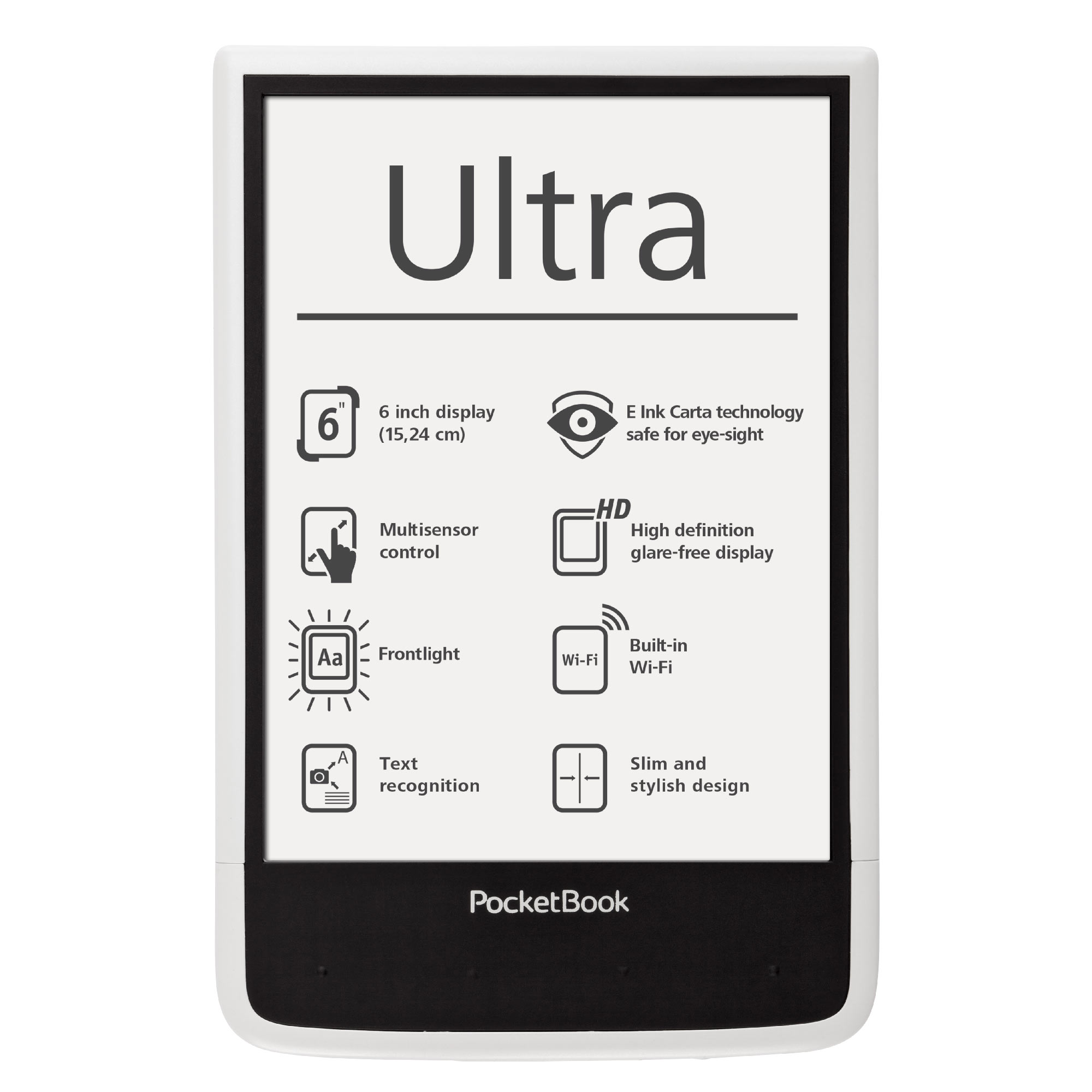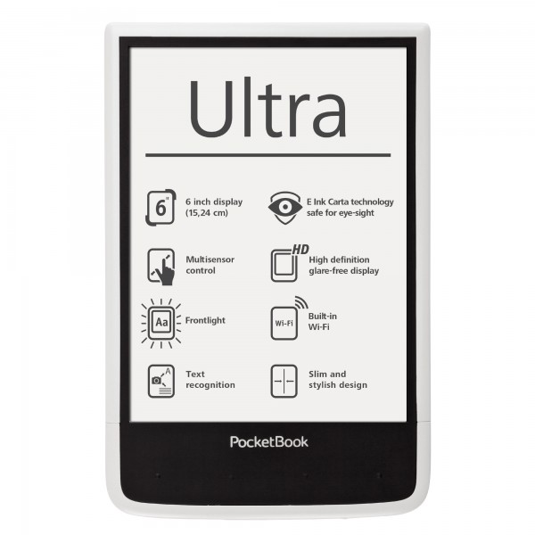 A kényelmes 162,7×106,7×7,9 mm méretekkel rendelkező PocketBook Ultra újgenerációs HD felbontású, LED világítású E Ink Carta™ kijelzője a készülék teljes első felületét elfoglalja, így a fényképezőgép és a lapozó gombok az e-könyv olvasó hátuljára kerültek, amely még kényelmesebb egykezes olvasást tesz lehetővé. A 4 GB-os belső memória és a microSD kártya bemenet egy egész könyvtár tárolására alkalmas, míg az 1 GHz processzor és 512 MB RAM zökkenőmentes és gyors lapozást biztosít. Az új e-könyv olvasó több mint 20 népszerű szöveg- és képformátumot támogat, és telepített ABBYY Lingvo® szótárakkal kerül forgalomba. A készüléken MP3 formátumú zenék és hangoskönyvek is lejátszhatók.