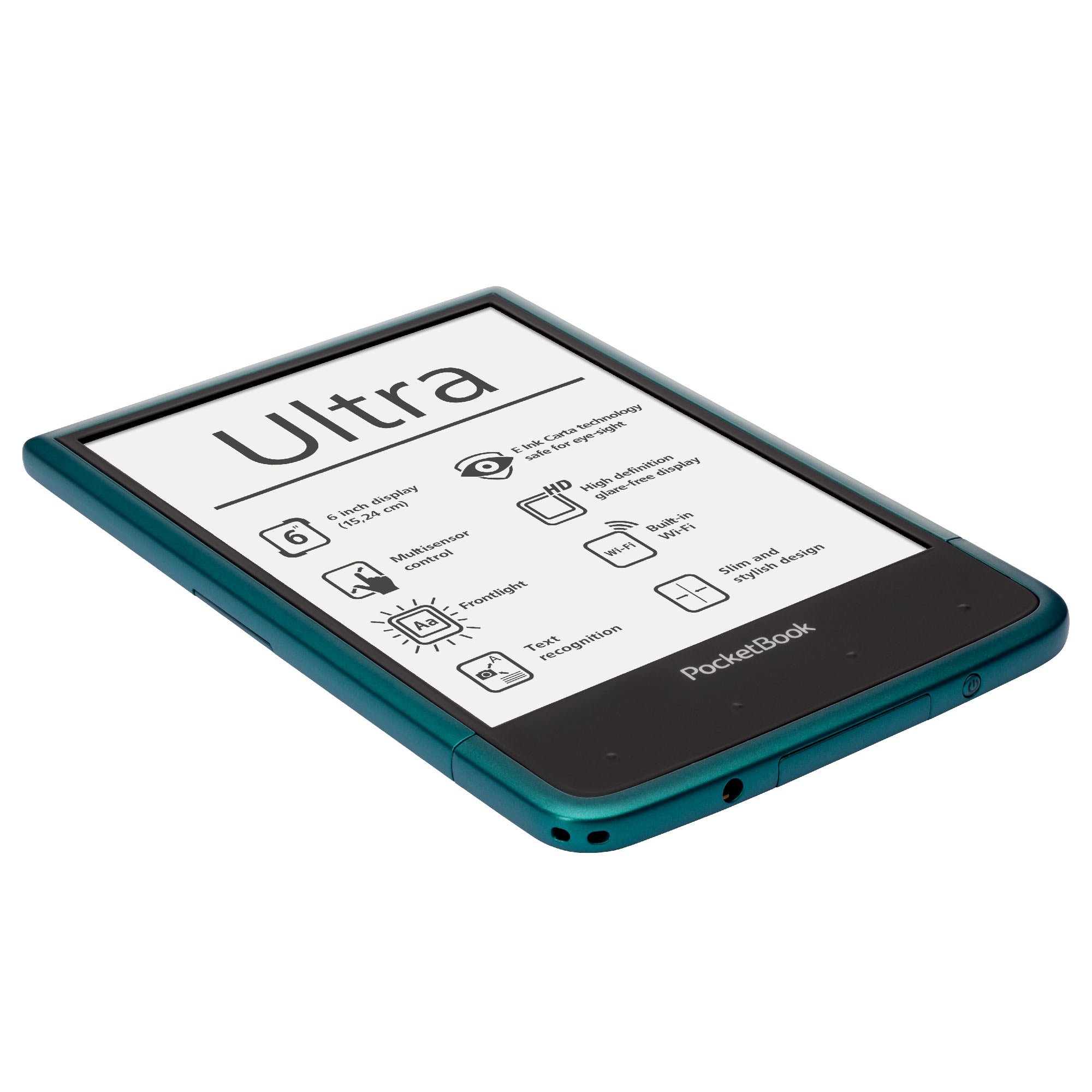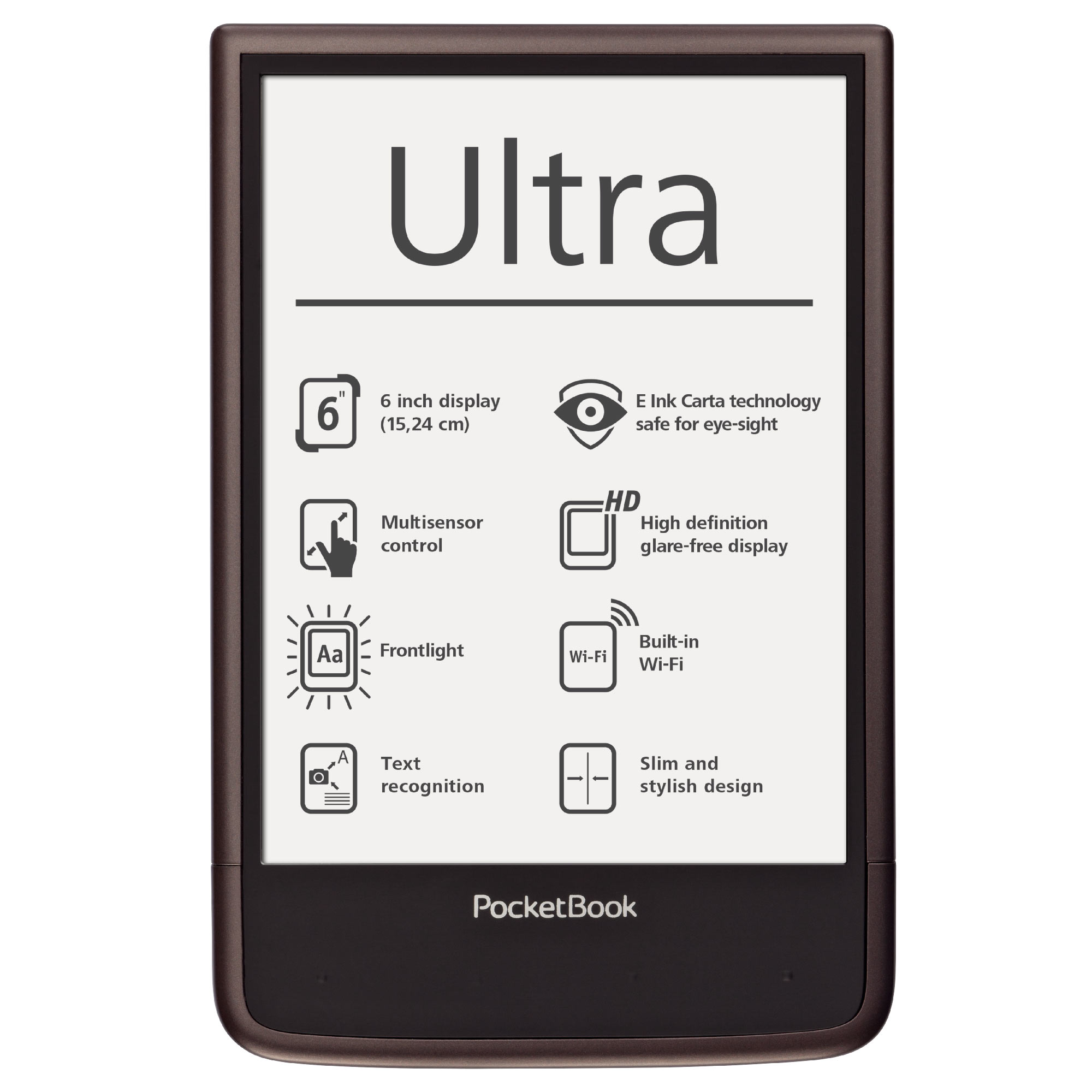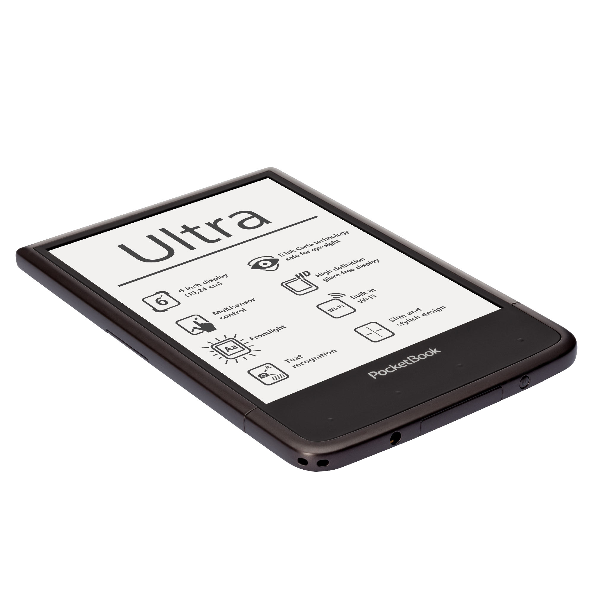 A kényelmes 162,7×106,7×7,9 mm méretekkel rendelkező PocketBook Ultra újgenerációs HD felbontású, LED világítású E Ink Carta™ kijelzője a készülék teljes első felületét elfoglalja, így a fényképezőgép és a lapozó gombok az e-könyv olvasó hátuljára kerültek, amely még kényelmesebb egykezes olvasást tesz lehetővé. A 4 GB-os belső memória és a microSD kártya bemenet egy egész könyvtár tárolására alkalmas, míg az 1 GHz processzor és 512 MB RAM zökkenőmentes és gyors lapozást biztosít. Az új e-könyv olvasó több mint 20 népszerű szöveg- és képformátumot támogat, és telepített ABBYY Lingvo® szótárakkal kerül forgalomba. A készüléken MP3 formátumú zenék és hangoskönyvek is lejátszhatók.