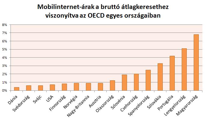 Magyarországon csupán 27,7 százalék a vezeték nélküli szélessávú internet penetrációja, míg az OECD országainak átlaga már elérte a 72,4 százalékot. A kelet-közép-európai régió országaiban 100 lakosra jelentősen több vezeték nélküli internetcsomag jut, Szlovákiában 55,3, Lengyelországban 61,3, Csehországban pedig 62,5. A mobilinternet elterjedésének gátja hazánkban elsősorban a magas árakban keresendő, ugyanis a mobilinternet átlagos ára a havi bruttó átlagkereset 6,8 százalékát teszi ki, amellyel jelentősen meghaladja a legtöbb ország arányát – adta hírül az Internetet.hu távközlési ár-összehasonlító portál.