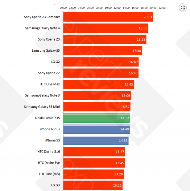 A legtovább a Sony Xperia Z3 Compact bírta, ez a modell 20 óra 1 percen át játszotta a filmet. A második helyre a Galaxy Note 4 futott be, a Samsung modellje 18 óra 55 percen keresztül tartott ki. A dobogó legalsó fokára szintén egy Xperia futott be, a Z3 18 óra 29 perccel segítette az impozáns eredmények eléréséhez a Sony-t.