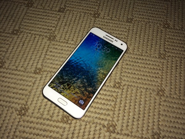A Galaxy E5 teljesen ugyan úgy néz ki, ahogy nagy testvére, csupán kicsit összement és kisebb kijelzőt kapott, ha egy 5 hüvelykes kijelző mondható kicsinek. A fél inches csökkenés talán jót is tett neki, sokkal jobban illik a kézbe és könnyebb használni a hétköznapi életben. A kijelző felbontása maradt 720 x 1280 pixel és a Super AMOLED technológiát is megőrizte. A képernyő kicsivel szebb képet ad, a nagyobb pixelsűrűségnek köszönhetően. A kijelző alatt a három szokott vezérlőgomb, felül pedig a másodlagos kamera, beszédhangszóró, egy Samsung feliratozás és a közelségmérő szenzor lett elrejtve. A fényszenzor itt kimaradt, ezért egy csúszkán tudjuk állítani.