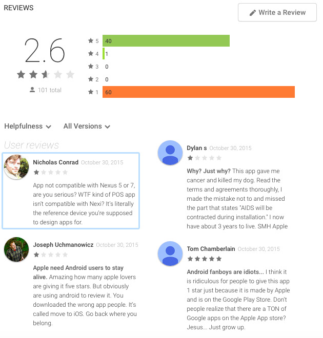 Ez a két, látszólag ártalmatlan program is elég volt a népharagra, hiszen szinte azonnal elözönlötték a dühős androidos felhasználók az applikációk oldalait és gyorsan jól le is húzták az értékelésekben. Persze a másik táborra sem kellett sokat várni, így kicsivel késöbb többen maximális értékelést adtak a két szoftvernek. Így mára szinte csak egy-, vagy ötcsillagos értékelések díszítik az Apple aloldalát.