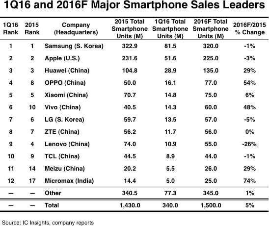 Egy évtizeddel ezelőtt még elképzelhetetlen lett volna, hogy a mobiltelefonos eladási listákra ne kerüljenek fel az olyan nagy nevek, mint a Sony vagy épp a Nokia. Pedig most épp ez a helyzet, az IC Insight felmérése alapján ugyanis az első negyedévet leginkább a kínai gyártók uralták. Természetesen a vezető hely továbbra is a Samsungé, a dél-koreai vállalat 81,5 millió telefont adott el, őket követi az Apple 51,6 millióval míg a dobogó legalsó fokára a Huawei állhat fel 28,9 millióval.