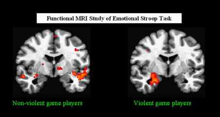Az fMRI az apró anyagcsere-változásokat méri az agy aktív területein. Ezek a képeken a színes részek. A két csoport között nem volt különbség reakcióidő és pontosság között, ám a képek tanúsága szerint az eltérő játéktípusok esetében eltérő agytevékenység figyelhető meg. Az erőszakos játékokkal játszók esetében az agy azon része, amely az önuralomért, a koncentrációért, és a gátlásokért felelős, jóval kisebb aktivitást mutatott, mint az erőszakmentes játékosoké.