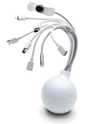 Ott van a számítógépünk, és számos más eszköz, csak éppen közös kapcsolódási pont nincs? Két nagyszerű megoldást is találtunk! Az úgynevezett Medusa Hub egy nagyon hasznos asztali periféria, ugyanis kiküszöböli azt a problémát, amikor egymás mellett túl szorosan helyezkedik el egyszerre több USB port. Alkotói ezáltal bebizonyították, hogy az esztétika igenis számít, ráadásul a használhatóság szempontjából is. A medúza „karjai” hat csatlakozóból (négy 2.0 USB port, kettő FireWire 400), egy lámpából és egy ventilátorból állnak. Ára 79,99 dollár.