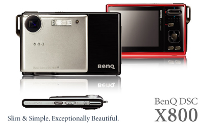 A szupervékony BenQ X800 modell 3 hüvelykes LTPS LCD kijelzőjének és a készülékbe teljes mértékben beágyazott prizma típusú lencséjének köszönhetően a létező legvékonyabb fényképezőgép. A kép beállítása közben a lencse mindig csak a készülék belsejében mozog. Különös tulajdonsága a BenQ DSC X800 modellnek, hogy mikrofényképező funkciójával akár 1 cm-ről is készít képet. Matt és kényelmes fogású előlapja, hajszálmintás fényes fekete-piros burkolata további eleganciát kölcsönöz a fényképezőgépnek.