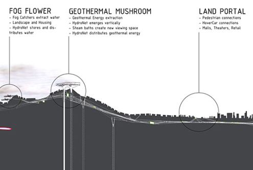 IwamotoScott látomása szerint a Hydro-Net nevet viselő város gomba alakú geotermikus épületek segítségével vonja ki a hőt és a vizet a föld mélyéből, emellett köd rózsák révén hasznosítja a levegő nedvességét például algák tenyésztésére, amelyből hidrogént állít elő üzemanyagnak. A földalatti alagutakban ugyanis H-meghajtású lebegő autók száguldoznak, bizonyítékául annak, hogy ásványi eredetű üzemanyagok nélkül is lehet élni, sőt!