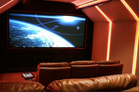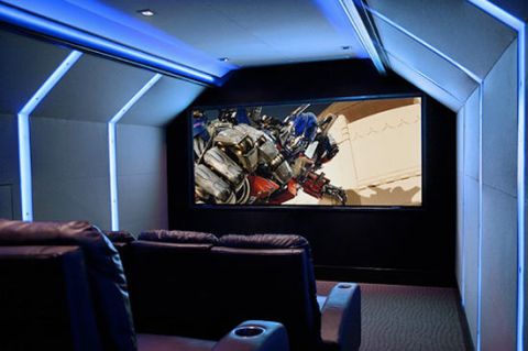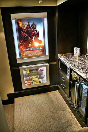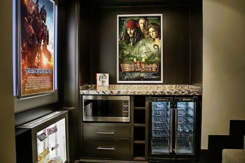 A falon egy hatalmas süllyesztett vászon kapott helyet, a beágyazott elemekben pedig DVD lejátszó és játékkonzolok találhatók, valamint az irányításért felelős Crestron rendszer. A tervező emellett mini- és italhűtőt, valamint a pattogatott kukorica kedvéért mikrohullámú sütőt is tervezett a helyiségbe.