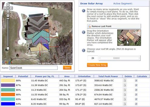 A weboldalon közelítsünk az adott területre, majd jelöljük ki azokat a részeket, amiket kiszemeltünk a napkollektoroknak – mivel a napelemes áramellátásnál a kollektorok tájolása döntő fontosságú. Magyarországon általában a déli irányú fekvés adja a legnagyobb energiahozamot és a napelemek elhelyezésére egy adott létesítmény, épület külső homlokzata és tetőfelülete, illetőleg a szabad földterület jöhet számításba. Ha ez megtörtént, a site kiszámolja, hogy mire számítsunk, mégis mennyi wattot nyerhetünk ki a Napból.