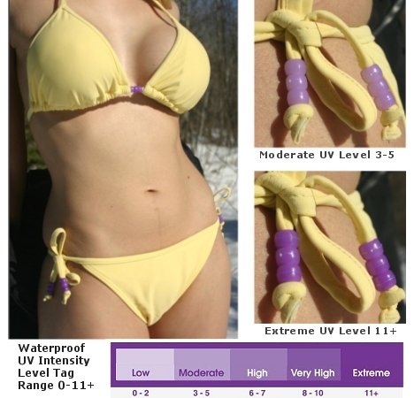 Nos, a százdolláros laptop mellé tegyük mindjárt a kosárba a hasonló árkategóriájú Solestrom SmartSwim UV Intensity Bikinit is, amelynek aprócska fényérzékeny gyöngyei színváltoztatással reagálnak az UV sugárzás mértékére: ha a bogyók halványlilák, nem vagyunk veszélyben, viszont ahogy sötétednek, úgy kell fokoznunk a napvédelmet.