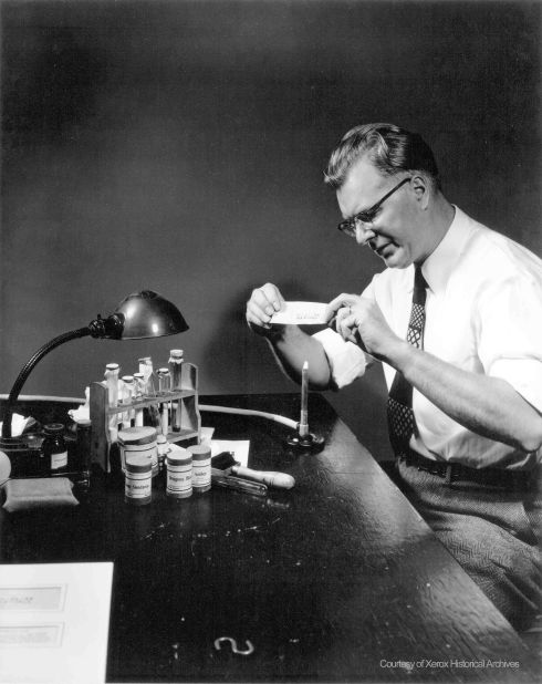 A fotografikus eljárásokat visszautasítva Carlson az elektrosztatikus töltésekkel és fotovezető anyagokkal kísérletezett, amelyek elektromos tulajdonságai fény hatására megváltoznak. Az eljárást xerográfiának nevezte el. A szó a görög xeros (száraz) és graphein (írás) szavakból ered. Két évtizeddel később egy Haloid névre hallgató Észak-New York-i kis vállalat bátor befektetésének köszönhetően került a találmány kereskedelmi forgalomba. A cég később Xerox Corporationre változtatta a nevét.