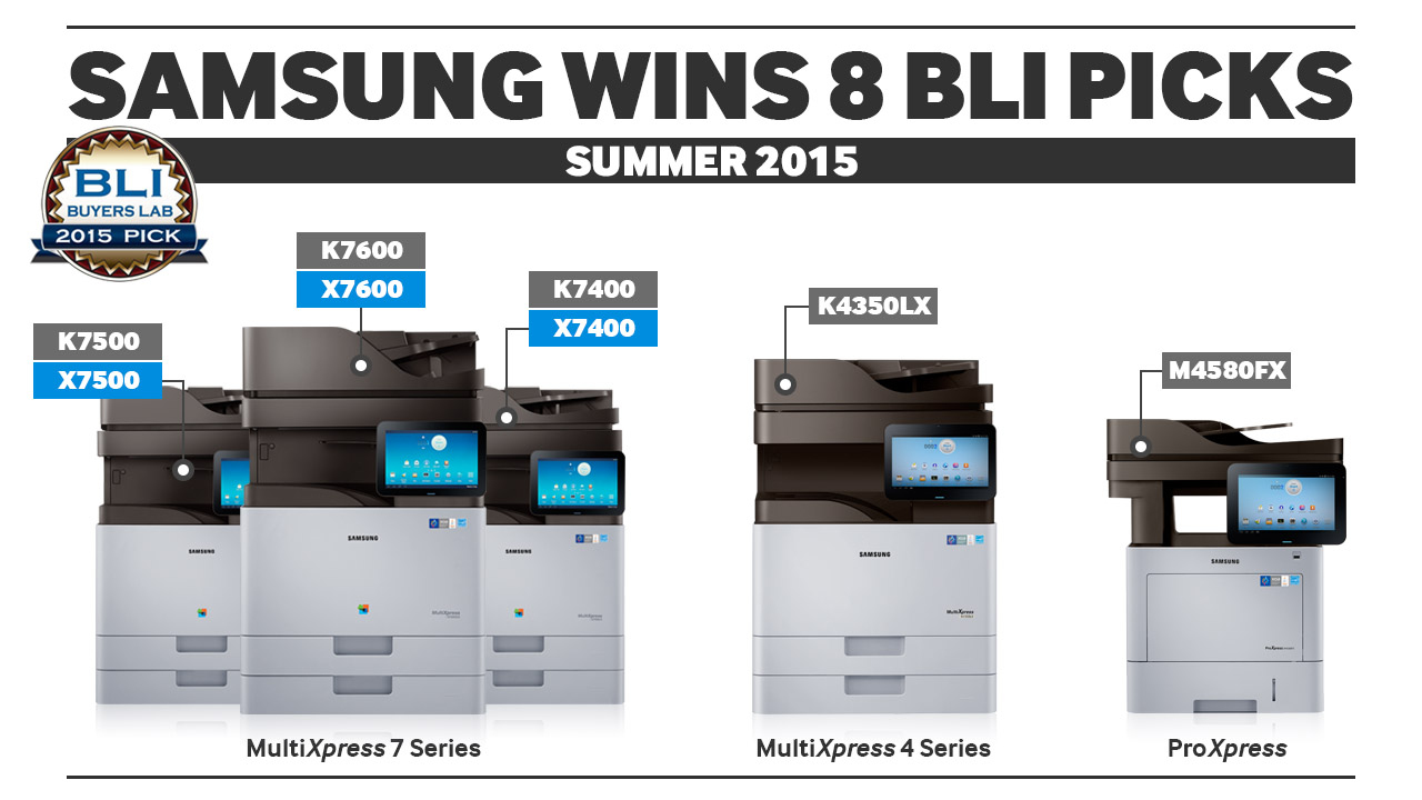 A Samsung Electronics nyomtatói nyolc Kiváló Teljesítmény díjat nyertek a Buyers Laboratory (BLI) „2015 Summer Awards”-en, ezek közül hét elismerést a SMART MultiXpress széria kapott. A Buyers Laboratory a digitális képalkotási iparág független elemző- is információ szolgáltatója, amely több mint 50 éve segíti a vásárlókat termékek közötti választásban.
