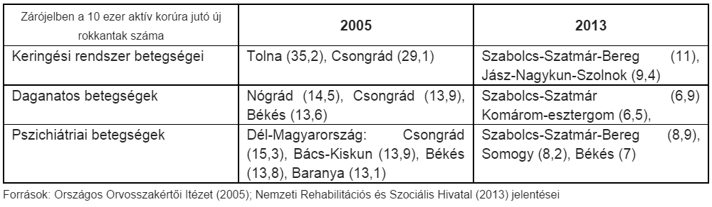Érdekes módon nyolc év alatt a rokkantosítás területi jellemzői is alapvetően átrendeződtek. Míg 2005-ben arányaiban a legtöbb rokkant Tolna, Csongrád, Békés és Baranya megyékben jelent meg (77-90 fő/10 ezer aktív korú), addig 2013-ban már Szabolcs-Szatmár-Bereg, Békés, Somogy és Komárom-Esztergom ( 34-40 fő/ 10 ezer aktív korú) megyék kerültek a lista elejére. Az új rokkantak aránya mindkét időszakban Hajdú-Bihar megyében és Budapesten volt a legalacsonyabb. A legnagyobb csökkenés Tolna megyében (90-ről 27-re), illetve Bács-Kiskun megyében (70-ről 19-re) következett be.