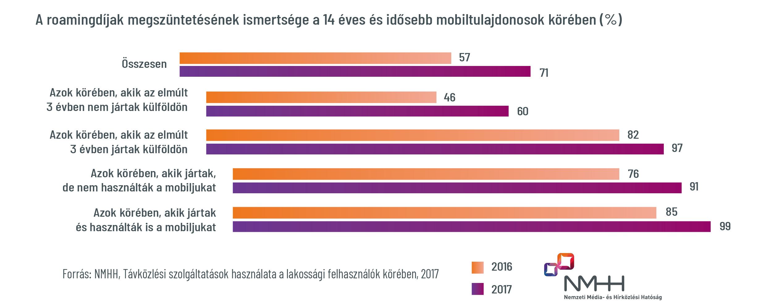 Az NMHH a szabályozási változásokról a bevezetés előtt és után is megkérdezte a magyarországi mobilhasználókat. A 14 évesek és idősebbek körében végzett felmérés eredményeiből egyértelműen látszik, hogy az eltelt – viszonylag rövid – idő alatt jelentősen megnőtt az ezzel kapcsolatos tájékozottság. Míg 2016 végén még a közel 8 millió mobilhasználónak csak valamivel több mint fele (57 százalék) hallott az új szabályokról, addig egy évvel később, a bevezetés után már tízből heten (71 százalék) értesültek róla valamilyen forrásból – ez alatt az időszak alatt egyébként sem a hazai mobilhasználók, sem a külföldön járók, sem az ott mobilt használók aránya nem változott számottevően.