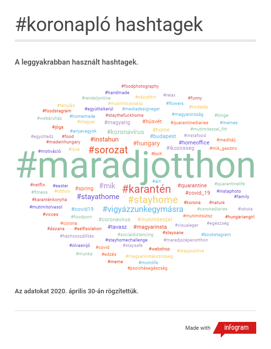 Összesen 482 599 nyilvános posztban megjelenő hashtaget elemeztünk a 2020. március 1. és 2020. április 30. közötti időszakban, amelyek a járvány kontextusában jelentek meg az online tér különböző csatornáin.