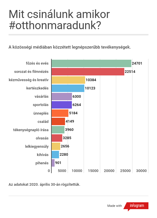 És ha már otthon maradtunk, úgy tűnik leginkább enni és sorozatot nézni, kertészkedni és vásárolni szeretünk. A hétköznapjaikat megörökítő netezők nagy részére tökéletesen illik a #netflixandchill mondás. Ha már mindent megettünk és megnéztünk sportolunk is egy kicsit, a családdal ünneplünk, vagy éppen olvasunk. A lelkiegyensúlyunkra is fordítunk figyelmet – elsősorban jógázunk vagy meditálunk. Ha pedig a versengő énünk kerül előtérbe, akkor pedig online kihívásokban veszünk részt.