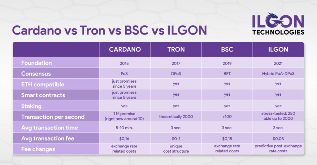 Itt pedig megtekinthető a videóban is látható összehasonlítás, mely a Cardano, a Tron, a BSC és az ILGON között jött létre: