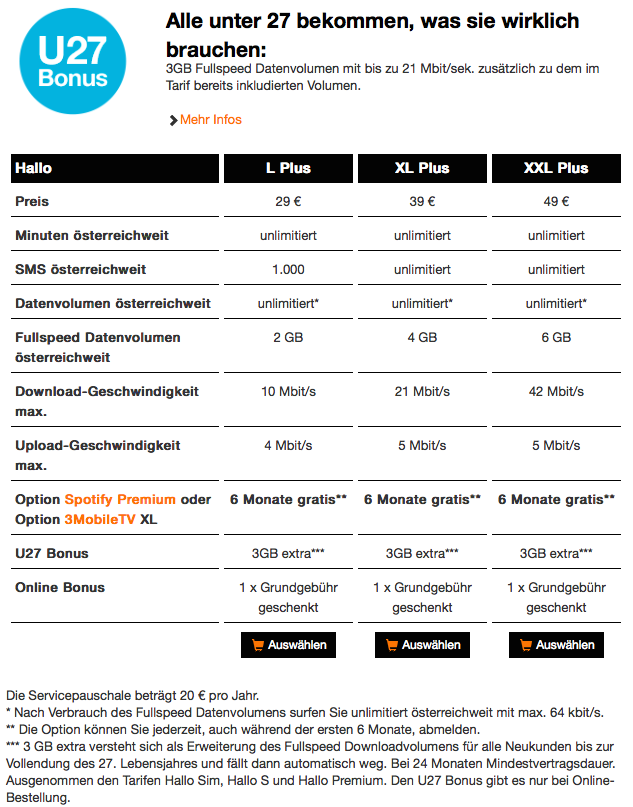 A Hutchison DREI megvásárolta az Orange ausztriai leánycégét, ezzel beolvasztva azt a saját, „3“ nevű szolgáltatóba. A két másikkal ellentétben is egészen bőséges csomagkínálat van, a legegyszerűbbet szimplán Hallo-nak hívják. Ebből a legkisebb Hallo S havidíja csak 3 ezer forint, és bár ebben csupán 50 MB a mobilnet, viszont 1000 perc belföldi beszélgetés és 50 SMS is. A legnagyobb Hallo XXL már 3000 perc beszélgetést, 1000 SMS-t és 6 GB-nyi netet ad, havi 12,5 ezerért. Persze van ennél jobb ajánlatuk is. A HalloPlus tarifák belföldön korlátlan beszélgetést és SMS-t adnak (a legkisebb „csak“ 1000 darabot), itt is a fullos XXL 6 GB internettel, illetve az első 6 hónapban ingyenes Spotify vagy mobiltévé bónusszal kínálja magát.