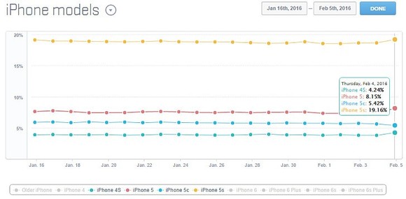 A 2014-ben megjelent 6-os modell óta jelentősen megnőttek a méretei az Apple telefonoknak, és ez sokaknak nem szimpatikus. Egy kutatás szerint a jelenleg almás telefont használók 40 százaléka ragaszkodik a 4 hüvelykes, 2014 előtti verziókhoz. Okoskészülékekre lebontva úgy néz ki, hogy legtöbben, 19 százalék, az 5s-t, 8 százalék az 5-t használja. Az 5c-t és a 4S-t további majdnem 10 százalék nyomkodja még naponta.