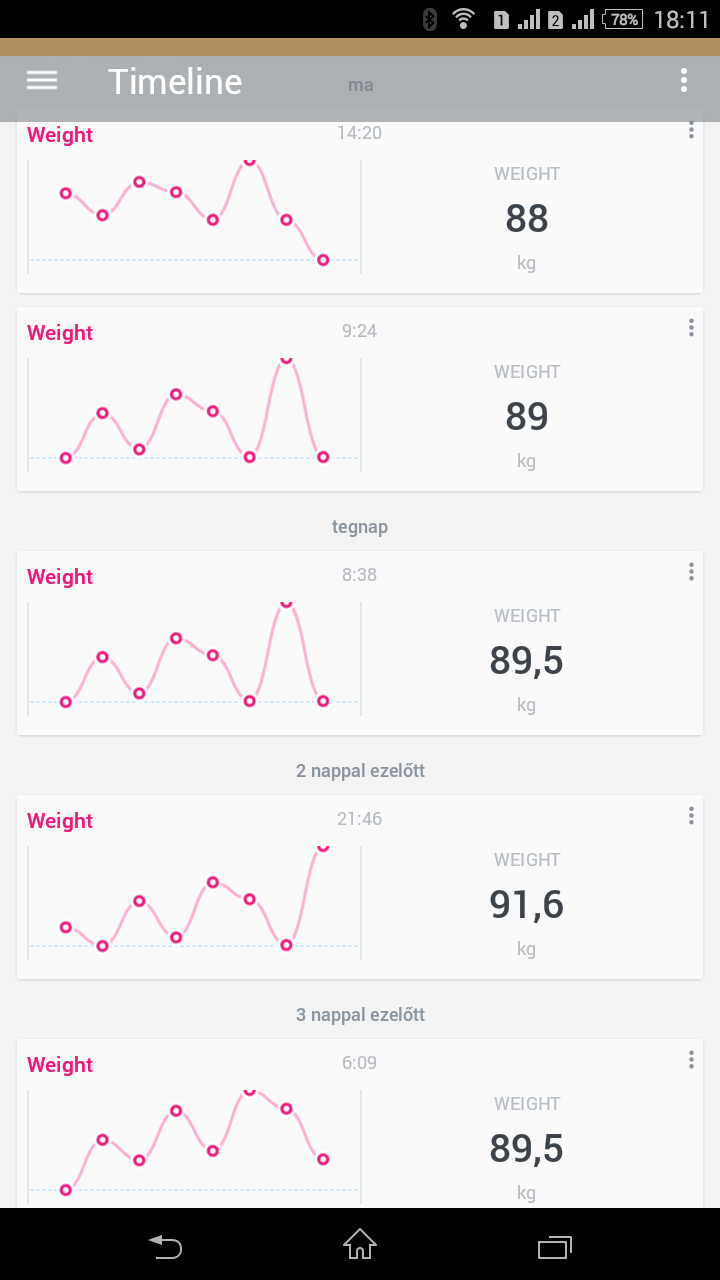 A szoftver szolgál a mérleg konfigurálására is. A Withings WS-30 ugyanis wifi kapcsolattal is rendelkezik, ennek beállítását is a telefonról tudjuk megtenni. Ha sikerült a hálózatot összelőni és a hozzáférési adatainkat megadni a Health Mate szoftvernek, a mérleg onnantól kezdve a mért adatokat interneten keresztül feltölti a profilunkba. Ha a családban többen is használjuk a mérleget (maximálisan 8-an), a mérleg a mért tömegből következtet arra, hogy valószínűleg ki állt rá éppen és ezt a mérés után egy hárombetűs kóddal (az én esetemben az SNC betűkkel) jelzi. Ha véletlenül hibázna (eddig egyszer sem hibázott), akkor utólag a mért adatot áthelyezhetjük, vagy törölhetjük is. A lényeg, hogy nem kell a mért adatok felvitelével bajlódnunk, minden megtörténik automatikusan. És ez nagyon jó dolog!