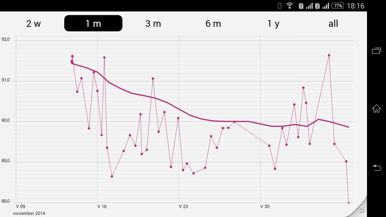 A mérleg használatánál én azt a módszert követem, hogy reggel felkelés után mérek egyet, majd este lefekvés előtt mérek még egyet. Ezen felül ha éppen idehaza edzek, akkor az edzés után, még vízbevitel előtt mérek egy pluszt. A mért adatokat a rendszer rögzíti és mutatja a tendenciát is, azaz ha egy jól sikerült vacsora után az ember kicsit többet mutat, vagy egy intenzív edzés után az ember kicsit kevesebbet, az nem zavarja meg az összképet. És amíg a görbe ereszkedő ívet mutat, nincs nagy baj. Még az is belefér, hogy a szülőknél tett látogatás után egy fél kilóval garantáltan többek leszünk. Azt persze figyelembe kell vegyük, hogy eleinte viszonylag könnyen veszítünk kilókat mert a zsír megy le, de ahogy az edzésekkel az izomtömeg növekszik, a fogyás kilókban mérve nem túl látványos. A látványosságot a tükör és az ismerősök megjegyzései erősítik meg, hiszen én mindössze 8 kilót fogytam eddig, de ezt úgy, hogy minimum 3-4 kiló izom felcsúszott a lábaimra és a kezeimre. Folyamatosan kapom is a megjegyzéseket, hogy milyen “girnyó” kezdek lenni, meghogy “Hová lett a pocak?”A kilók mérése tehát nagyon fontos, de azért nem a legfontosabb.