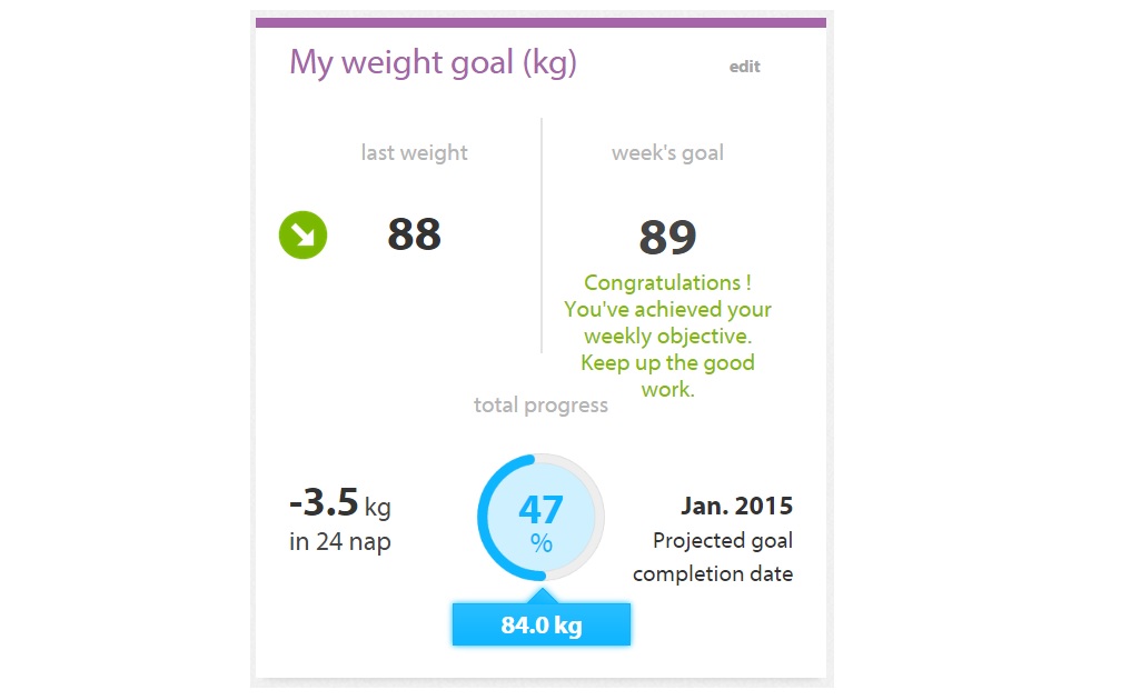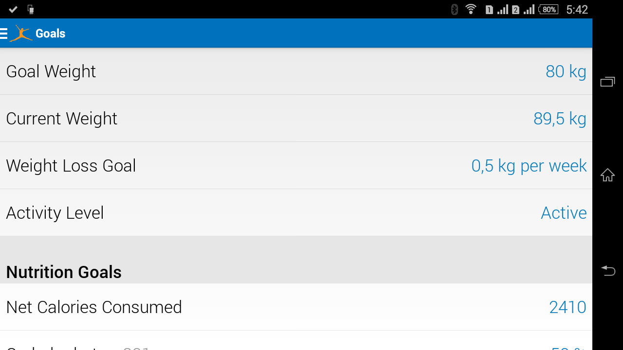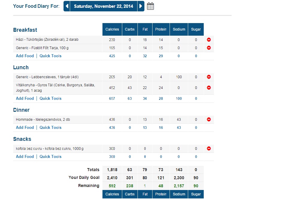 A My Fitness Pal egyik legnagyobb szolgáltatása, hogy a fogyáshoz ad segítséget. Az adataink megadása után (jelenlegi kilók, magasság, nem), meg kell adjuk a célunkat, azaz azt, hogy hány kilóra szeretnénk lemenni. Erre a szoftver javasol egy optimális fogyási ütemet és ehhez lövi be a napi engedélyezett kalóriabevitelt. Az én esetemben 84 kilót céloztam meg, ez 13 kilós fogyást jelent. Ennek fényében a szoftver meghatározta, hogy naponta nekem 2410 kalóriát lehet bevinni. Itt kell megjegyeznem, hogy nagyon nagy keveredés van a fejekben a kalória és a kilokalória között. A helyes megnevezés a kilokalória lenne, hiszen az ételek energiatartalma ebben értendő. De mivel a köznyelv – nem csak a magyar, az angol is – a kalória kifejezést használja, a legtöbb szoftver is lehagyja a kilo prefixumot. Amikor tehát azt mondjuk, hogy egy házilag elkészített szalámis szendvicsben 400 kalória van, valójában kilokalóriát kell érteni. A helyzetet bonyolítja az is, hogy a kalória nem szabványos (SI) mértékegység. Az ételek csomagolásán ezért Joule-ban is megtaláljuk az energiaértékeket, de a legtöbb szoftver kalóriában számol. Olyan ez, mint a lóerő: nem szabványos, de soha nem fog kimenni a köztudatból.