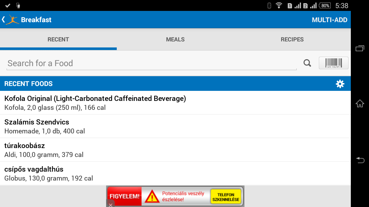 Ha már említettem a kalóriákat, hadd térjek egy kicsit ki arra, miért éppen a My Fitness Pal alkalmazással számolom azokat. Nos, a fő ok az volt a kiválasztásánál, hogy van neki Androidos változata is (ide kattintva letölthető), amellyel az étkezést követően a telefonomról bevihetem az adatokat. Ezt is szoktam csinálni, mert az a helyzet, hogy sokszor már este (néha már pár óra múlva) sem emlékszem arra, mit ettem délben. A My Fitness Pal adatbázisa nagyon nagy, az ételek (köztük a magyar ételek) nagy része benne van és egy rövid kereséssel megtalálunk mindent, magyar nyelven is. Amikor nagy ritkán valami olyasmit eszem, ami nincs benne az adatbázisban, akkor különböző főzős blogokról ki szoktam lesni a kalóriákat és azok alapján felviszem az ételt. A legjobb funkció mégis az, amikor egy üdítőről, vagy más vonalkóddal ellátott kajáról a vonalkód alapján tudja a tudnivalókat. Ilyenkor nincs más dolgunk, mint a vonalkódot a telefon kamerája elé tartani és ámuldozni. Még a ropit is ismeri (a gyártót, a mennyiséget) és kemény kalóriákkal bünteti a bűnözéseinket.