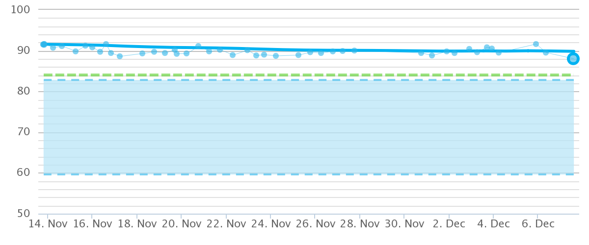 A Health Mate összekapcsolható számos más szoftverrel, így például a Garmin Connect-tel is. Ha ezt megtesszük, a Garmin Connect-ben megjelennek a mért kilók is. Ettől függetlenül a Health Mate is sok mindent meg tud jeleníteni, ezek közül a testtömegünk változása tud nagyon inspiráló lenni. Amikor látjuk, hogy milyen szépen mennek le a kilók, egészen új lendületet kapunk az edzéseinkhez. Mind a telefonon, mind a webes felületen látjuk a fogyásunkat és azt is, hogy mikorra és mennyit szeretnénk lefogyni. Gyakorlatilag egy szempillantással megnézhetjük, hogy jól haladunk-e, vagy rá kell tegyünk-e egy lapáttal az edzésekre, vagy csak simán többet kell mozogjunk. Azt is látjuk, hogy a testtömeg-indexünk alapján benne vagyunk-e a normál zónában, illetve mennyit kell fogyjunk (vagy híznunk) ehhez. Én például februárig szeretnék lemenni 84 kilóra, de a távolabbi cél valahol egy hetessel kezdődő szám. Például 79. Nem elérhetetlen…