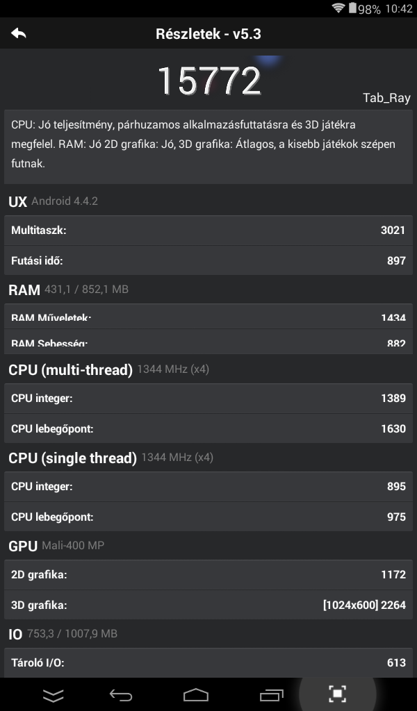 Ezt a pocit arra tervezték, hogy a fogyasztást alacsonyan tartva is ki tudjon szolgálni gépeket és ez jellemző is rá. Nem sokat fogyaszt és ha nem éppen valami gyilkos grafikával rendelkező játékkal nyúzzuk, tényleg sokáig elvan egy töltéssel. A procit egy Mali-400MP grafikus egység támogatja, mégpedig kétmagos, amely nagyon erős a videók visszajátszásánál is és 1280×800 pixelig is bírná, így ezt az 1024×600-as képernyőt röhögve elrángatja.