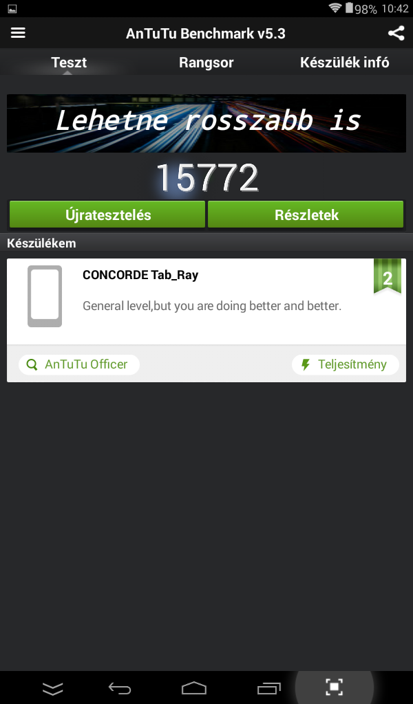 Kapcsoljuk hát be és jöjjön a következő ámulat! Ha csak egy fél évvel ezelőtt, 20 ezres környékén vásároltunk tabletet, azzal szembesültünk, hogy többnyire egy akadós, nagy kompromisszumok árán elfogadható tabletet kaptunk a pénzünkért. Erre most itt a ConCorde tab Ray és nem akad és úgy általában nagyon rendben van. A felhasználói élmény a belé épített négymagos Allwinner procinak köszönhető, amely 4 x 1,3 MHz-en ketyeg és már az erősebb játékokkal is jó eséllyel megbirkózik.