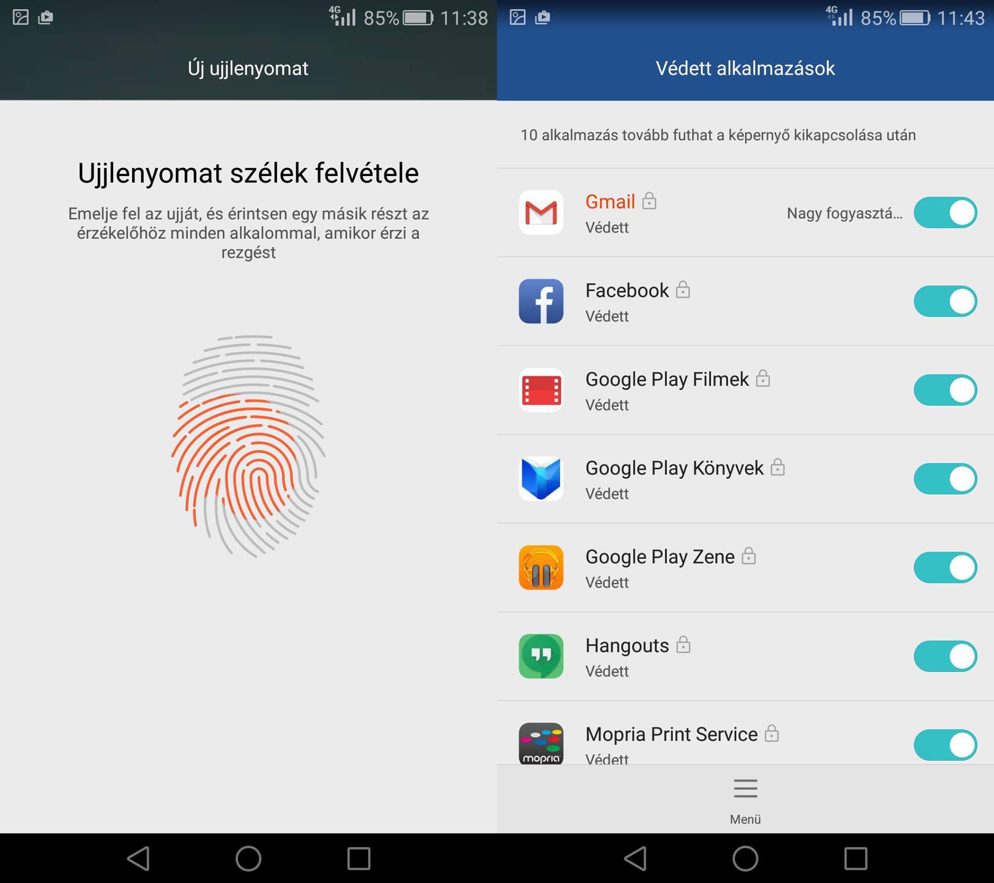 Mint már említettem, a Mate S hátoldalán egy ujjlenyomat-olvasó is helyet kapott. A biztonsági berendezést a beállítások menüpontban konfigurálhatjuk, ilyenkor néhány alkalommal hozzá kell érintenünk az ujjunkat, majd a szoftver eltárolja a szükséges információkat.