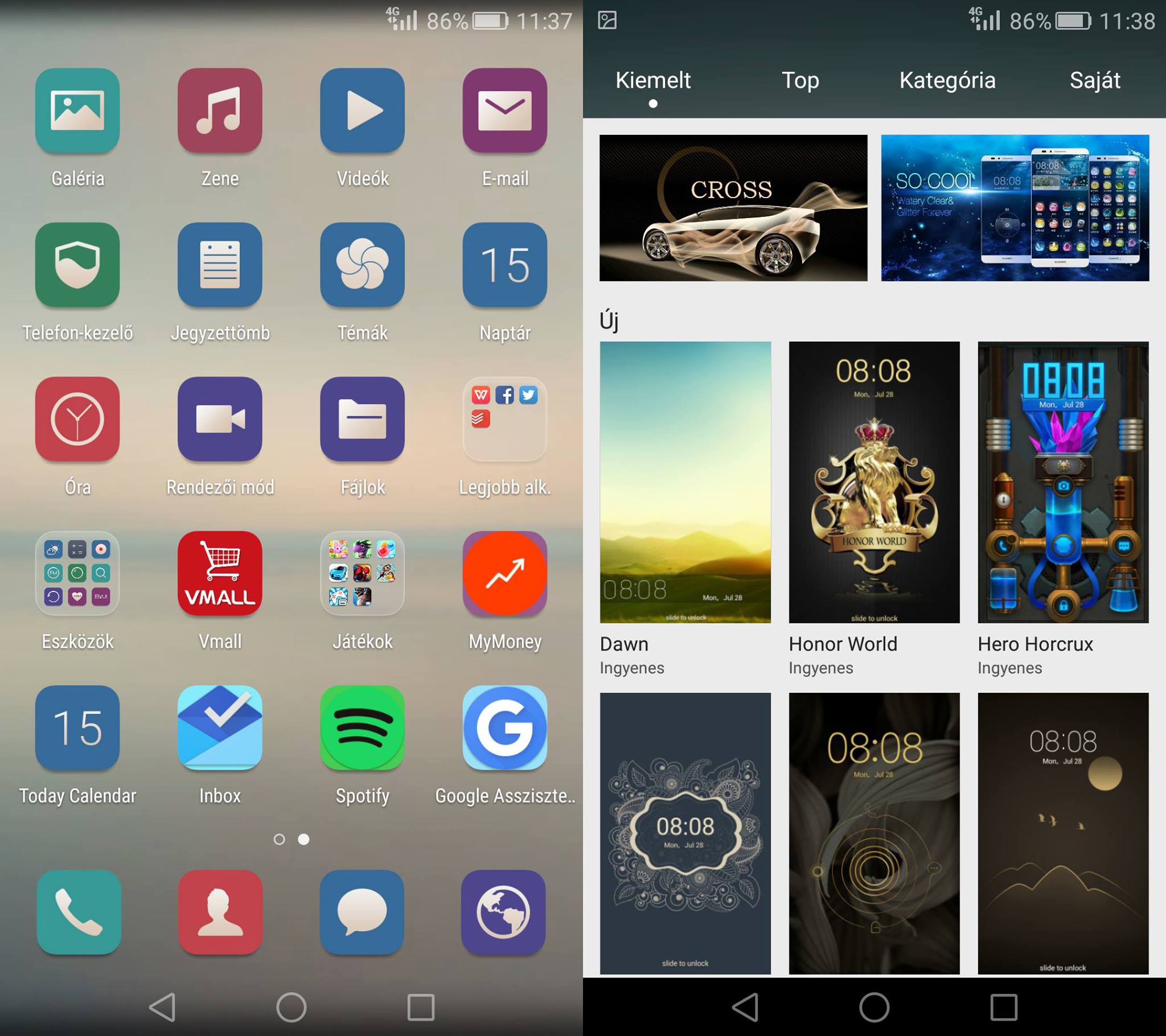 Jó hír, hogy a microSD bővítés mellett választhatunk 64 GB-os és 128 GB-os tárhelyet is, utóbbi a különleges képernyőjével még jobbá teszi az amúgy is fejlett telefont. A Huawei többi telefonjához hasonlóan a Mate S-en is az EMUI 3.1-es felülete foglal helyet. Ez csakúgy, mint a készülék külseje, igen letisztult stílussal rendelkezik, véleményem szerint az egyik legszebb a gyári felületek között. Persze akkor sincs gond, ha a mi izlésünknek ez nem felel meg, a Téma menüpontban mindenki megtalálhatja a neki leginkább megfelelőt. A felület különlegessége, hogy az iPhone-okhoz hasonlóan nincs konkrét menü, helyette a főképernyőn lapozva érhetjük el az alkalmazásokat.