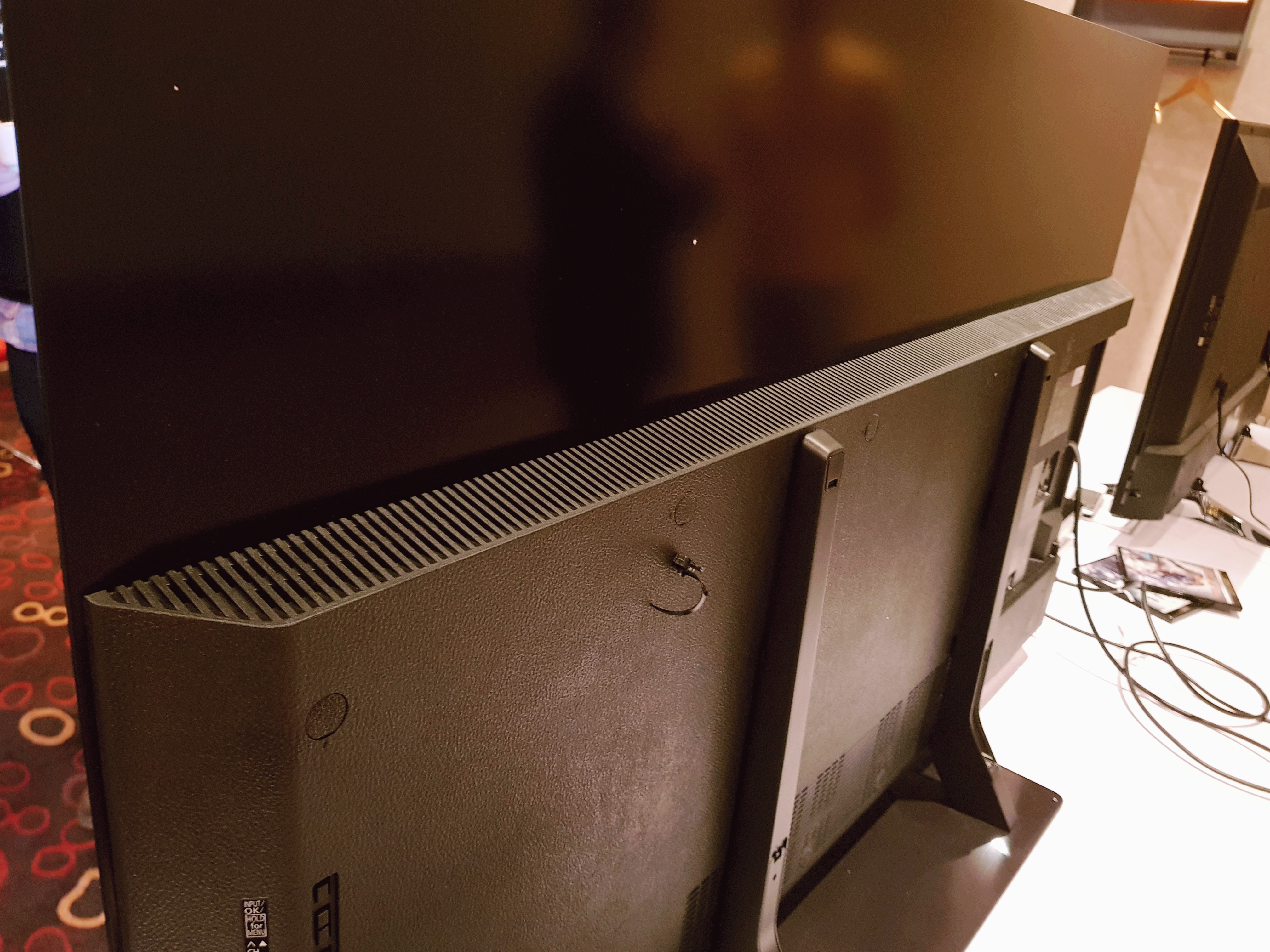 Miután összeraktam magamban a képet, hogy az a vastag rész gyakorlatilag a hangszóróknak lett csak kialakítva, akkor eszméltem rá, hogy igen, ennyire vékony a képernyő. A képen látszik is, hogy szinte alig észrevehető, körülbelül olyan vastag lehet, mint egy mobiltelefon oldalról. Több fotót is próbáltam készíteni róla, de alig lehet elkapni a vastagságát, pontosan azért, mert szinte nincs is neki!