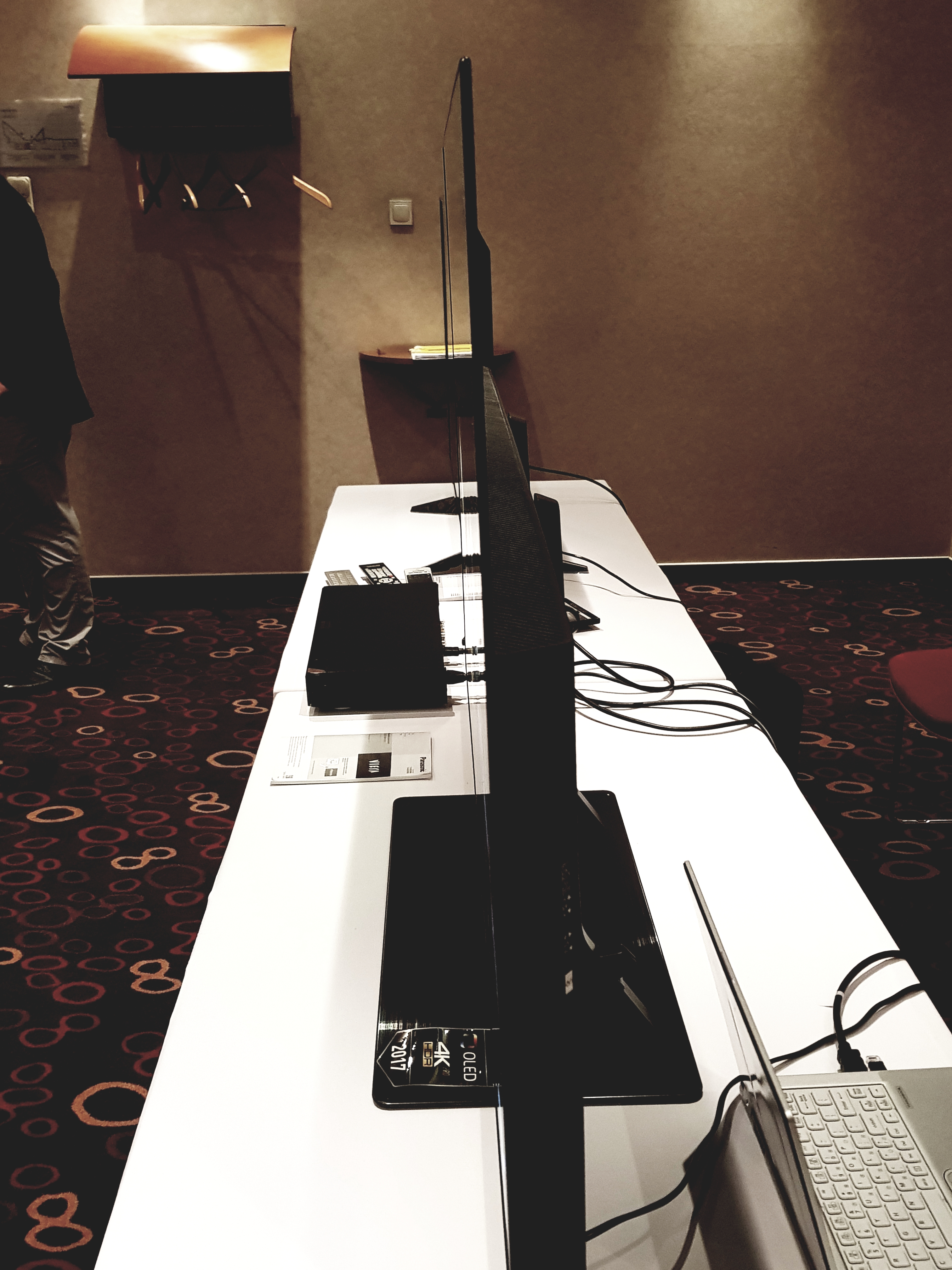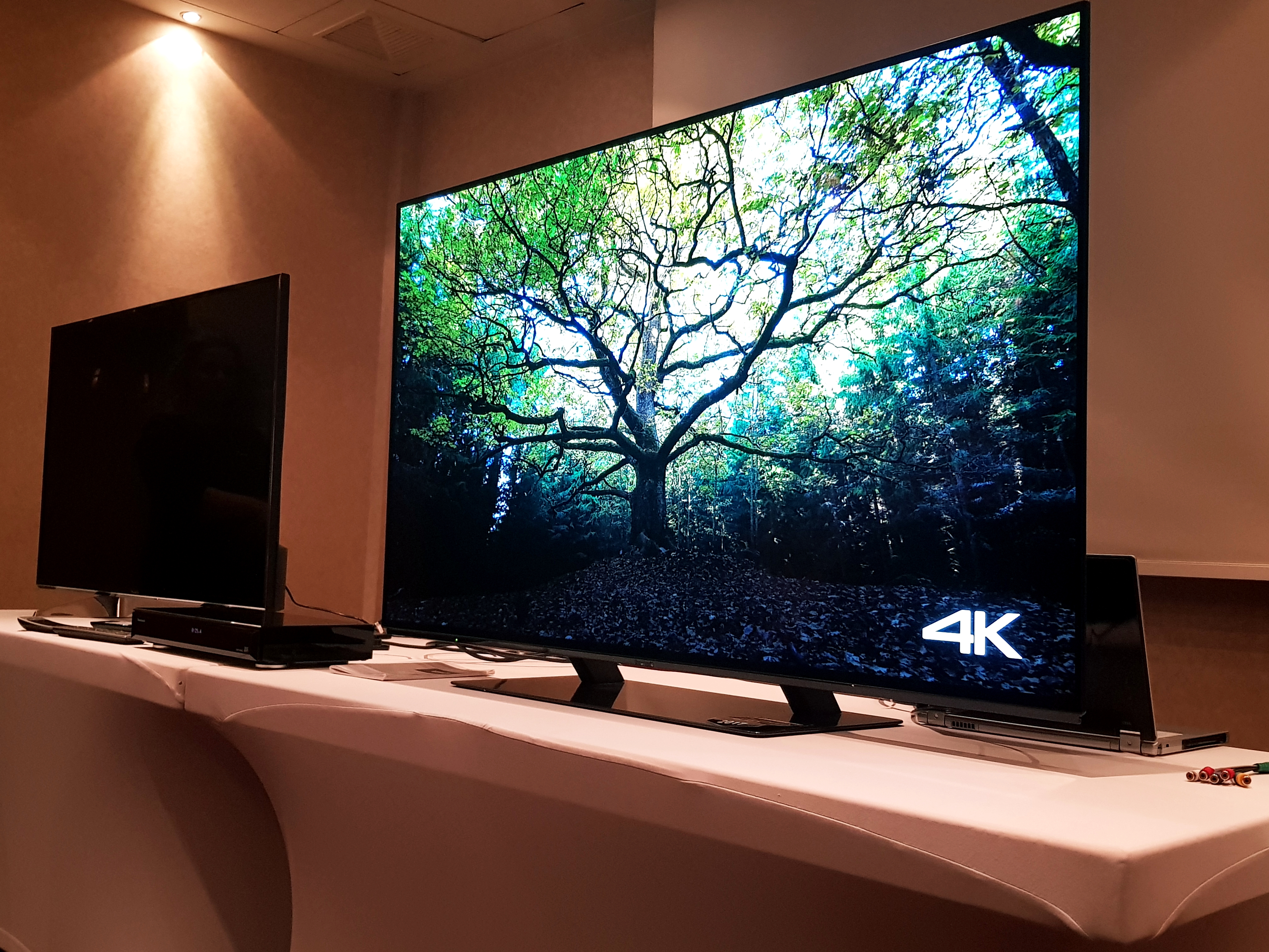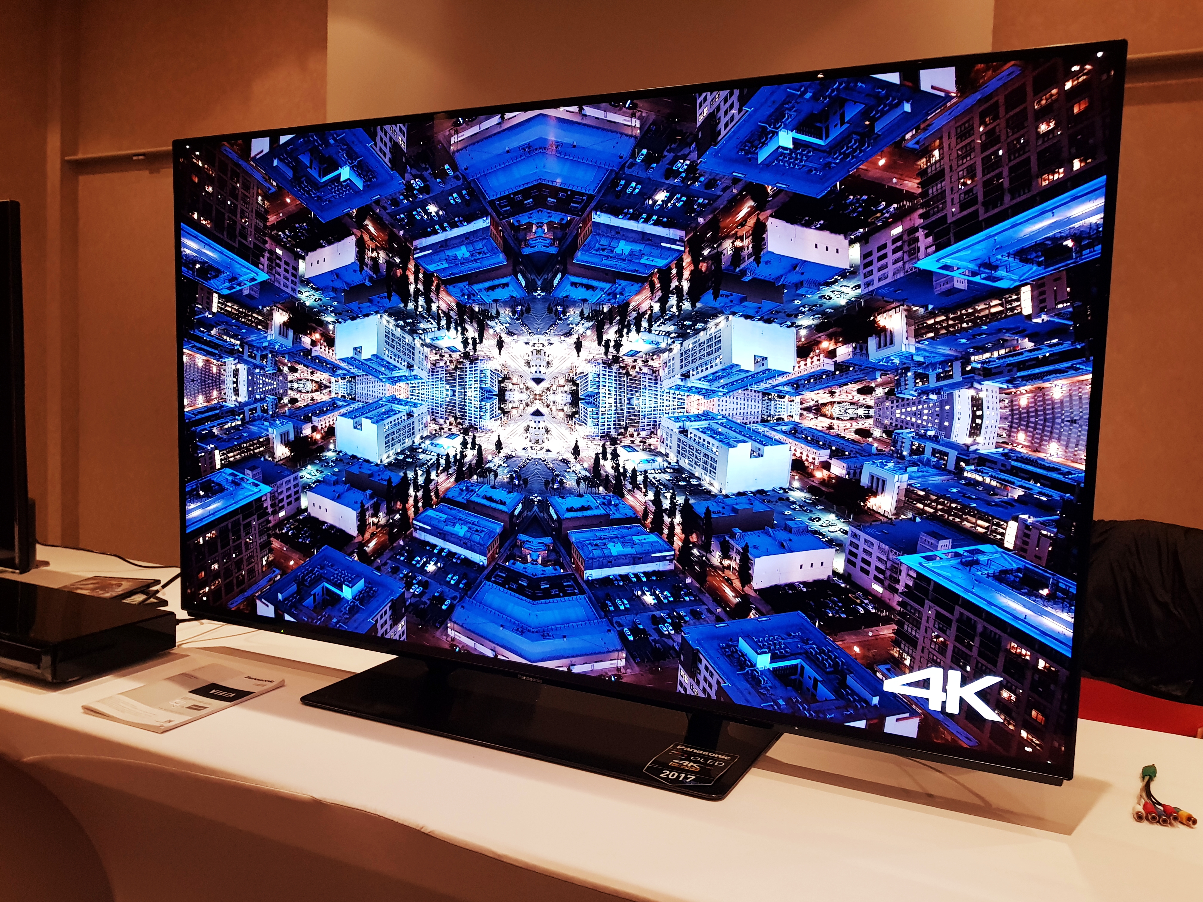 Ez a két legjellemzőbb tulajdonsága van a Panasonic legújabb 4K-s OLED TV készülékének. Ugyebár itt a lényeg nem más, minthogy nem egy kollektív háttérvilágítás történik, mint az LCD, vagy az IPS panel esetén, hanem itt maga a „pötty” világít, tehát ha nem világít akkor ténylegesen feketét látunk, ha pedig világít, akkor a tényleges adott színt, mindenféle torzítás nélkül. A felbontás 3840×2160, ami értelemszerűen még a jól megszokott Full HD 1080p-nél is sokkal élesebb képet ad. A látható képátló 140 cm-es volt ebben az esetben (az 55 hüvelykesnél), de lehet rendelni ennél még nagyobbat is, bár a jelenlévő szakemberektől megtudhattuk, hogy ennél nem igazán szoktak nagyobbat rendelni, kifejezetten ritkaságszámba megy a 70 hüvelykes TV-k eladása.