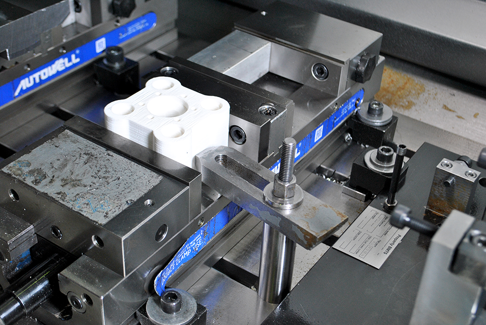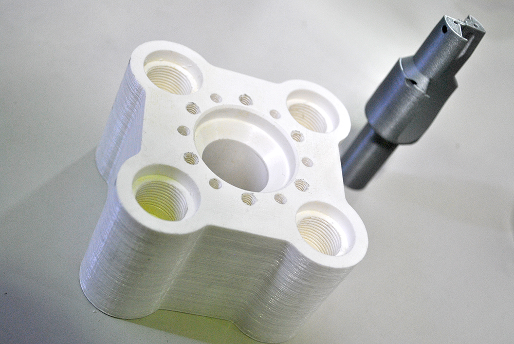 A teszthez készített 100x100x60 mm méretű proto szerszámot a FreeDee Printing Solutions teljesen tömören nyomtatta ki PLA alapanyagból. A gyártás közel egy napig tartott egy kifejezetten termelésre, hosszabb nyomtatásokra optimalizált MakerBot Replicator+ 3D nyomtatón. Összesen 470 gramm műanyagot használt fel hozzá az amerikai gép, amely alapanyagköltsége mindössze nettó kétezer Forintra tehető. A tömör modellt ezután a POWER TOOLS Kft. egy 3-tengelyes megmunkálóközpont segítségével alakította egyszer vízhűtéssel, egyszer pedig anélkül. A marógéppel néhány mikron pontosságig finomították a nyomtatott alkatrészt és furatokat is elhelyeztek benne. Természetesen a modellt a megmunkált végterméknek megfelelően, furatokkal ellátva is lehetett volna nyomtatni, azonban a teszt egyik célja az volt, hogy a PLA műanyag megmunkálhatóságát vizsgálják az egyébként fémekhez fejlesztett gépeken. A vízhűtés hatása főleg a felület síkmarásánál mutatkozott meg, ahol az így kezelt modell teteje kevésbé lett sorjás, szebb felszínt és pontosabb furatokat eredményezett.