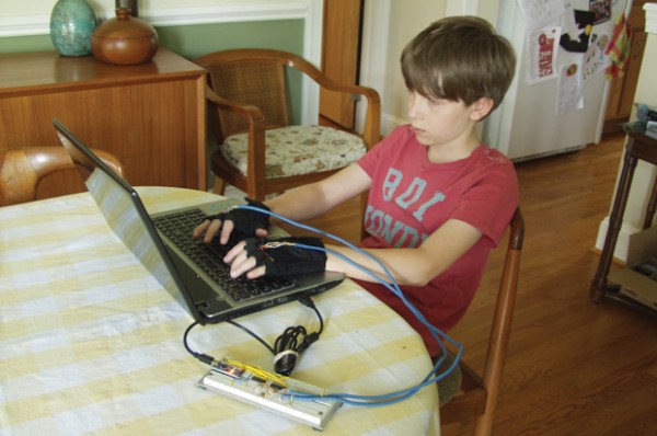 David Schneider saját készítésű, rezgő kesztyűkkel tanítja 11 éves fiát gépírni.
